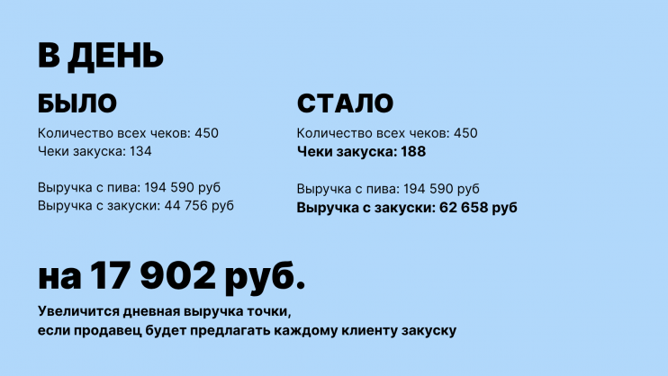 Всего в день приходит 450 покупателей, из них 134 — уже покупают закуски, а 316 — уходят с напитками, но без закусок.