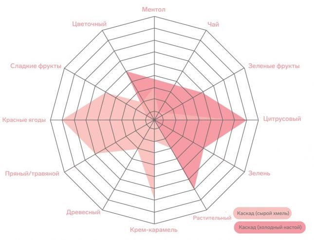 Химические соединения, которые вы добавляете в пиво через хмель, в бокале могут оказаться совсем другими. Терпены весьма неустойчивы и легко превращаются в терпеноиды, которые пахнут и ведут себя по-другому. Именно поэтому большинство продавцов хмеля используют два профиля на своих паутинках. На примере ниже видно, как отличается профиль Cascade между сырым хмелем и холодным настоем. При варке возникают дополнительные различия, и их не так просто предсказать. Эти изменения особенно заметны во время ферментации.