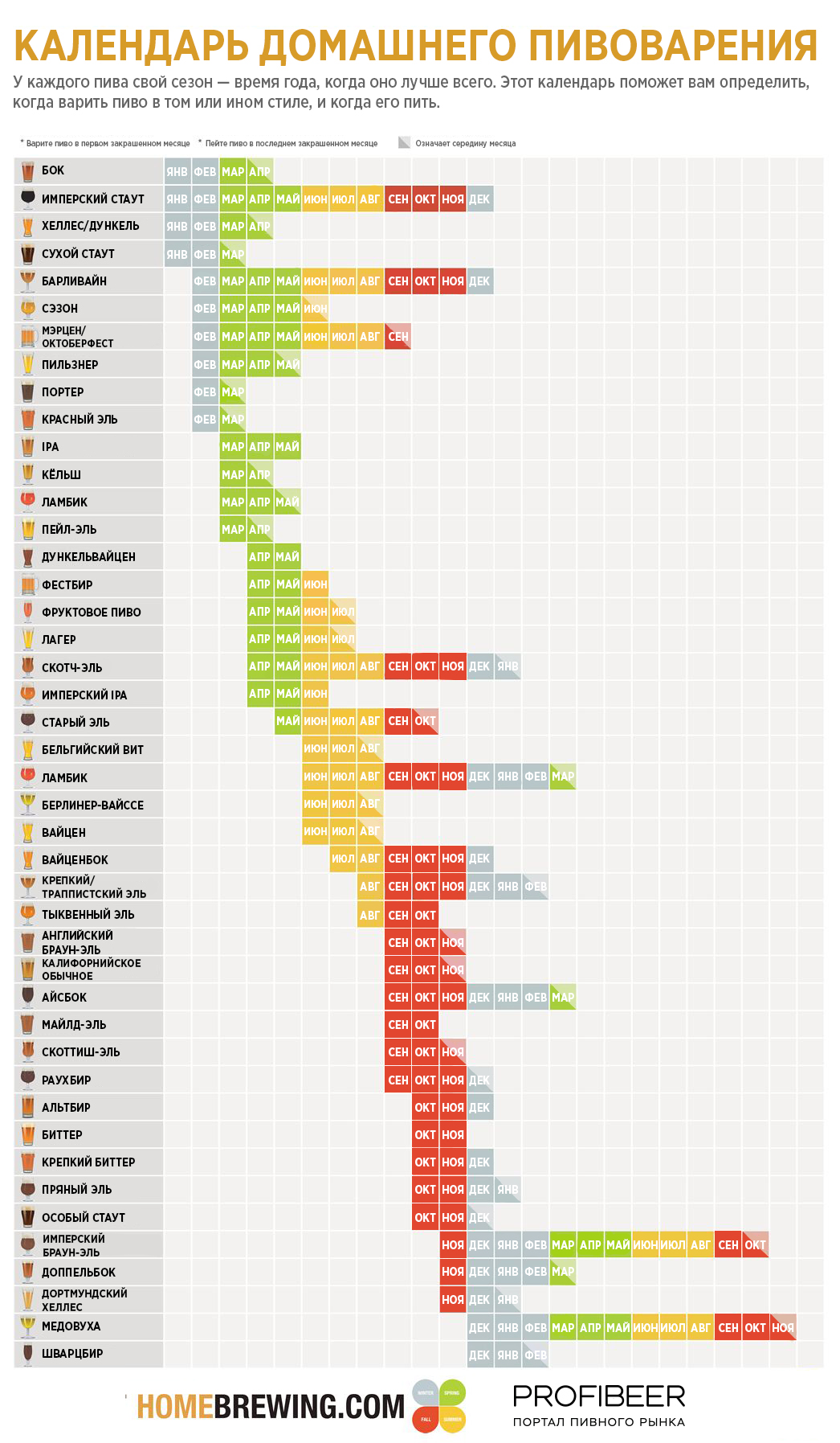 Сайт Homebrewing.com составил наглядный календарь, который поможет запланировать время варки пива. Календарь показывает, когда нужно начинать варить тот или иной стиль — с учётом того, сколько времени ему потребуется на брожение и созревание, и того, в какое время года его лучше всего пить.