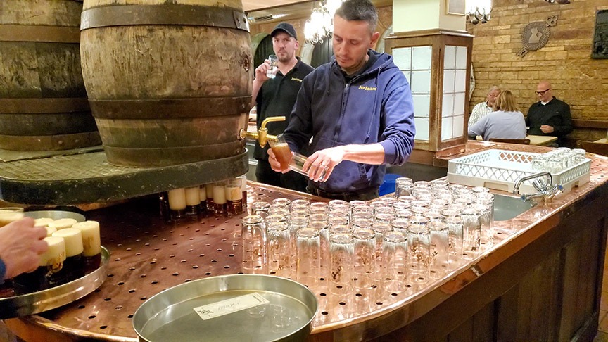 Затем пиво либо разливают по бутылкам или кегам, либо отправляют в специальные деревянные бочки и позднее подают в тапруме пивоварни. Бочки изнутри покрыты специальным пищевым полиамидным покрытием под названием Durolit, поэтому вкуса дерева в пиве нет. Однако бочки нужны не только для красоты. Крайне важно, чтобы пиво подавалось при правильной температуре, в идеале 5–7 °C, чтобы бочку успели опустошить до того, как пиво станет слишком тёплым. Schlüssel взяла себе за правило не оставлять столитровую бочку на баре больше чем на час. При полной посадке они могут пролить такую бочку за 17 минут — очень впечатляющее зрелище!