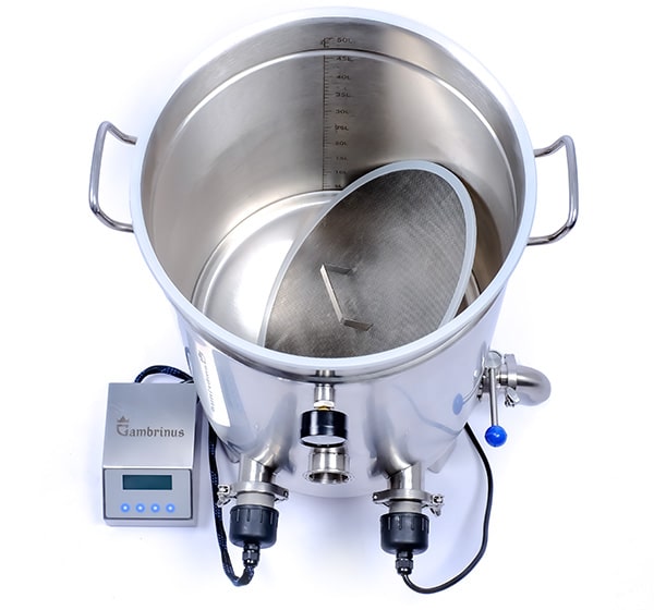 Принципиально другая схема нагрева и охлаждения, отсутствие мешка, фальшдно, конусное дно заторного котла с устанавливаемым фильтром-отсекателем бруха, усовершенствованная мешалка, возможность варки разных объемов от 15 до 50 литров. Кроме того, есть возможность к увеличению объема котла до 90 литров или превращению его в самогонный аппарат.