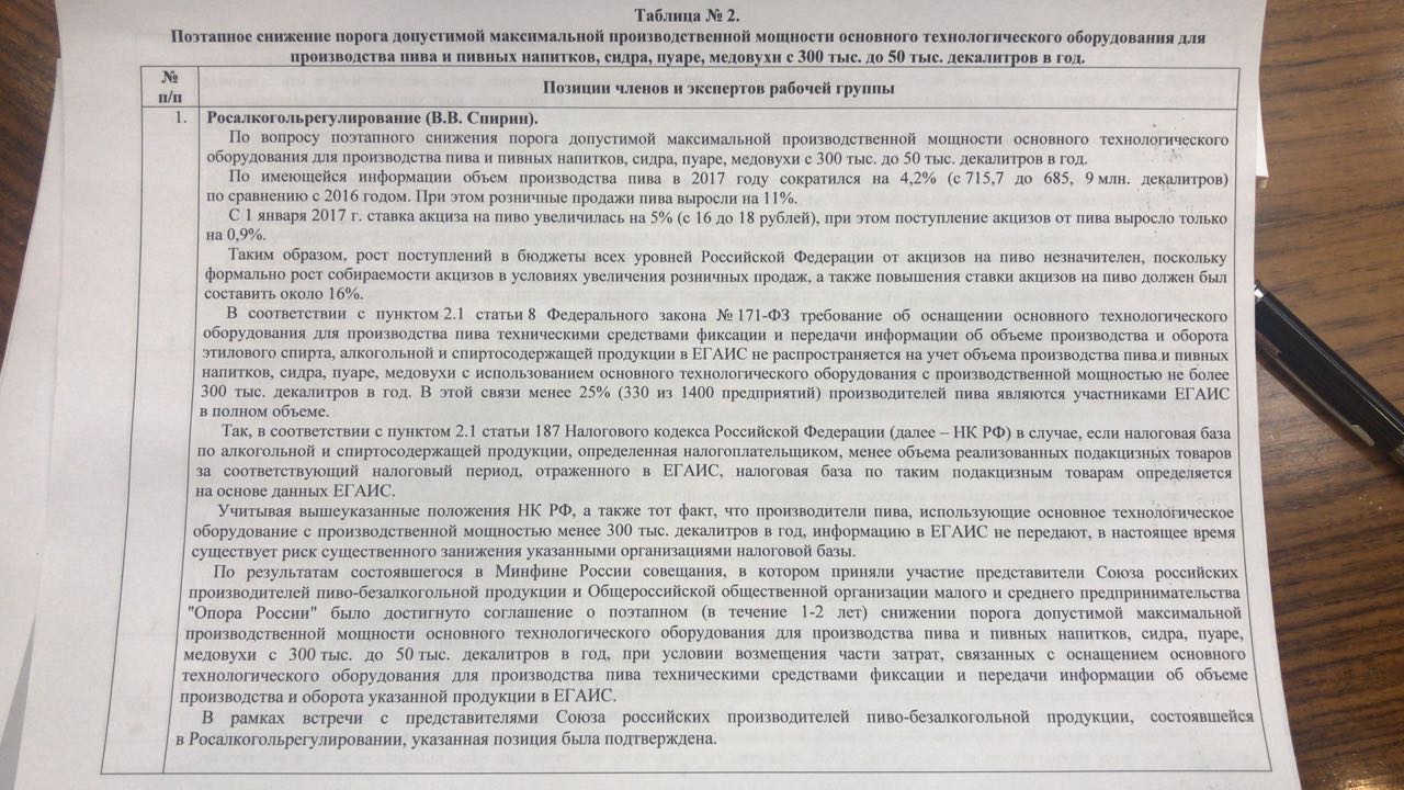 По результатам состоявшегося в Минфине России совещания, в котором приняли участие представители Союза российских производителей пиво-безалкогольной продукции и Общероссийской общественной организации малого и среднего предпринимательства «ОПОРА России» было достигнуто соглашение о поэтапном (в течение 1-2 лет) снижении порога допустимой максимальной производственной мощности основного технологического оборудования для производства пива и пивных напитков, сидра, пуаре, медовухи с 300 тыс. до 50 тыс. декалитров в год, при условии возмещения части затрат, связанных с оснащением основного технологического оборудования для производства пива техническими средствами фиксации и передачи информации об объеме производства и оборота указанной продукции в ЕГАИС».