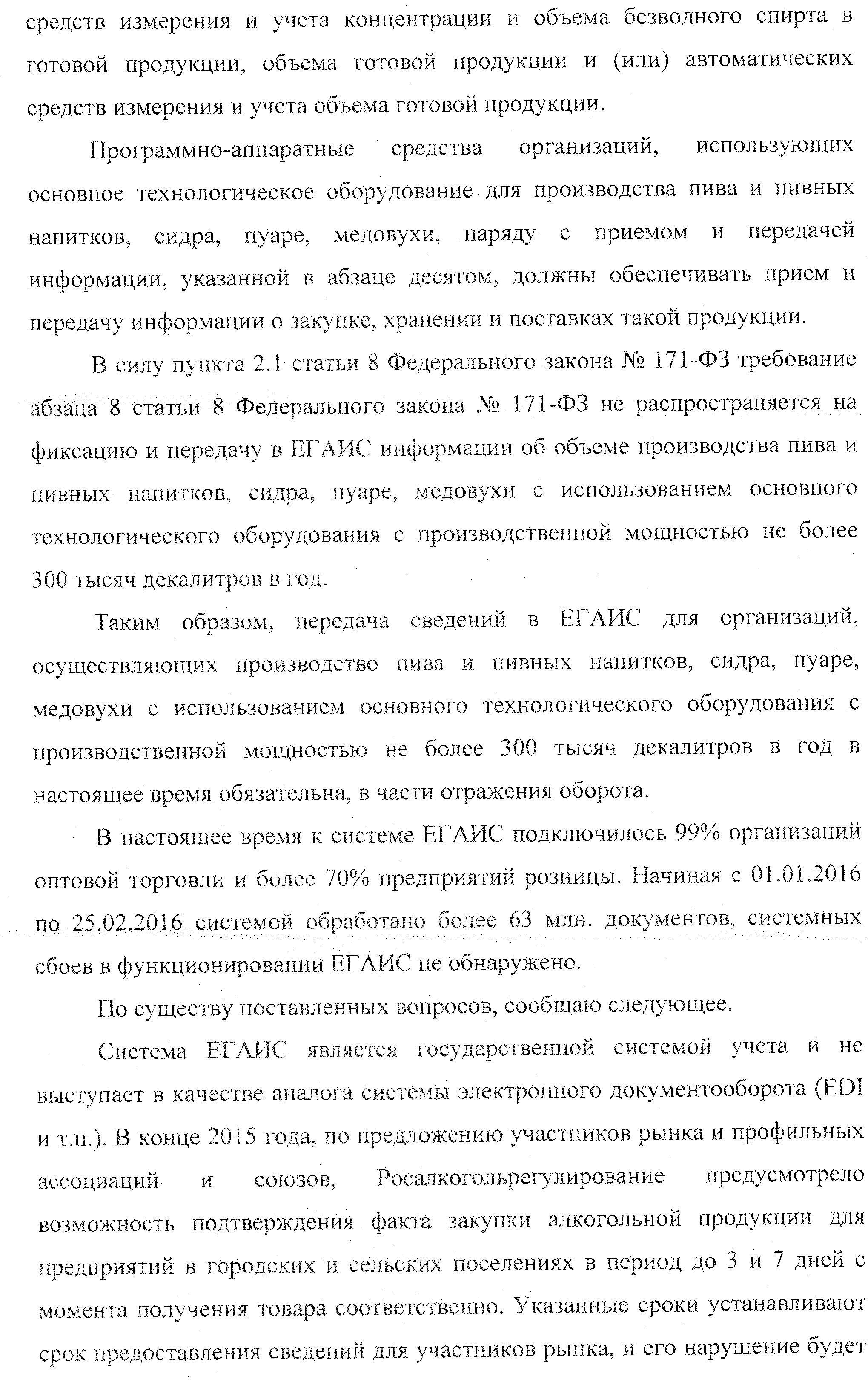 « В соответствии с пунктом 2.1 статьи 8 Федерального закона №171-ФЗ требование об оснащении основного технологического оборудования для производства пива техническими средствами фиксации и передачи информации об объеме производства и оборота этилового спирта, алкогольной и спиртосодержащей продукции в ЕГАИС не распространяется на учет объема производства пива и пивных напитков, сидра, пуаре, медовухи с использованием основного технологического оборудования с производственной мощностью не более 300 тыс. декалитров в год. В этой связи менее 25% (330 из 1400 предприятий) производителей пива являются участниками ЕГАИС в полном объеме».