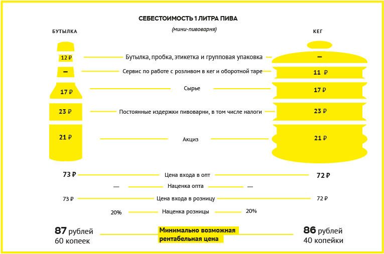 – Помимо акцизов, надо учитывать еще и себестоимость, которая для отечественных сортов составляет 13-17 рублей, а для импортных – от 20-25 рублей, – считает аналитик ГК «ФИНАМ» Алексей Коренев. – Добавьте сюда заработные платы сотрудников пивоваренных компаний и сетей реализации, затраты на логистику и хранение, закупку и эксплуатацию оборудования – суммы получаются весьма значительные.