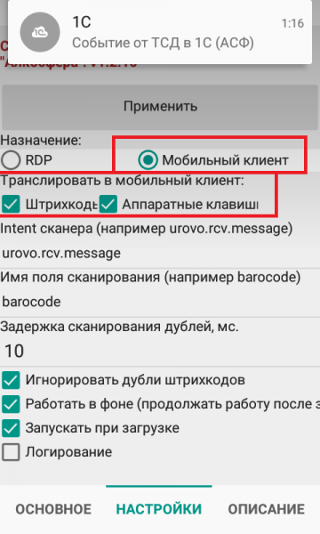 Настройка ТСД (через RDP или посредством использования мобильного клиента) (Внимание! Настройка через мобильного клиента допустима только при использовании платформы 1С 8.3.12 (на этой платформе официально не работают продукты УТАП10, 1С ЛВЗ, 1С КАТАП 1 – то есть, для них организуется только терминальное подключение). Внимание! Известные специалистам проблемы передачи сканированного кода с устройства (ТСД) в терминальную сессию решены утилитой собственной разработки компании «Алкосфера»)