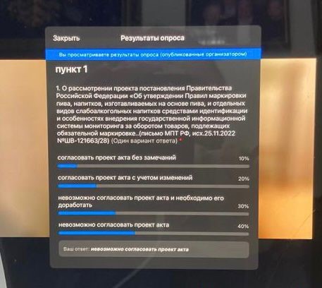 28.11.22 в 10 утра в рабочей группе по «гильотине» в сфере алкоголя было назначено очередное, уже третье, голосование по вопросу маркировки пива, причём назначено было с нарушением нормативных сроков, последние документы нам, членам группы, пришли накануне в воскресенье поздно вечером. Руководитель рабочей группы, не приняв никаких замечаний по срокам рассмотрения документов, а также не обратив внимания на вопиющий факт, что один и тот же документ, голосование по которому уже прошло, выносится на голосование третий раз, тем не менее, предложил голосовать. Стало очевидно, что у него одна задача — любой ценой, но обеспечить голоса за предлагаемый документ (правила маркировки пива). Тем не менее, голосование показало, что большинство рабочей группы в очередной раз высказались принципиально против маркировки. Это было зафиксировано в 10:08 (скриншот прилагаю).