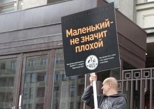 К зданию Госдумы вышел человек с плакатом с надписью «Маленький — не значит плохой. Мы против того, чтобы о нас судили только по размеру».