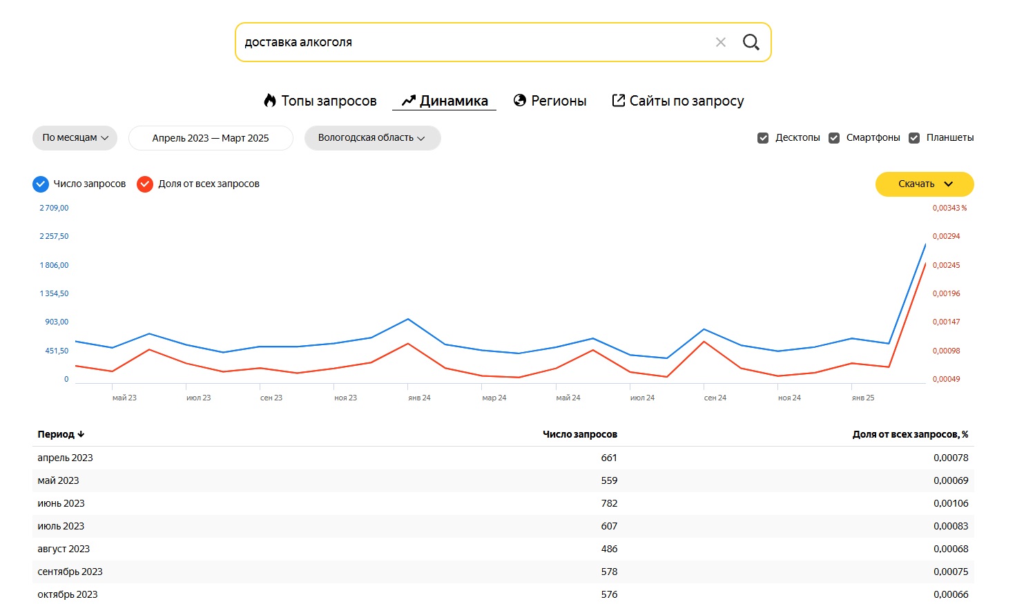 То, что люди ищут различные способы обойти ограничения по времени, подтверждает статистика «Яндекса». Согласно сервису «Вордстат», в марте на Вологодчине в четыре раза выросло число запросов: «доставка алкоголя». Запрос «купить алкоголь» стал использоваться вовсе чаще в шесть раз.