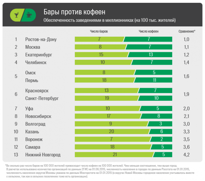 В Екатеринбурге преимущество баров чуть ощутимее, 15 против 13 кофеен (на 100 тыс. человек). В Санкт-Петербурге оно почти двукратное — на 100 тыс. жителей города на Неве приходится 19 баров и 10 кофеен.