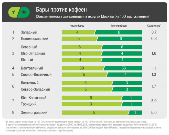 В Москве только в двух округах обеспеченность населения кофейнями выше, чем барами — в Западном (в 1,5 раза) и Новомосковском (в 1,2 раза). В трех округах наблюдается равенство, в Северном на 100 тысяч жителей приходится по 6 кофеен и баров, а в Юго-Западноми Южном — по 4. В остальных семи округах преобладают заведения, где есть алкогольные напитки.