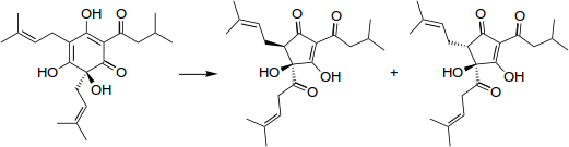 Что такое IBU? Эта аббревиатура означает International Bittering Unit – международная единица горечи. Одна единица равна одному миллиграмму горьких веществ на литр пива. Откуда происходят эти горькие вещества? Из хмеля. Но вот в чем загвоздка: в хмеле изначально нет компонентов, которые делают пиво горьким. В нем есть их прекурсоры – кирпичики, из которых воздействием высокой температуры образуются горькие компоненты. Вот так выглядит реакция изомеризации, в результате которой альфа-кислоты превращаются в изо-альфа-кислоты.