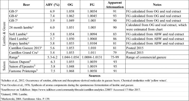 Я должен отметить, что представленная далее информация, которую я смог найти, взята из разных источников, к тому же ламбики могут сильно отличаться друг от друга у разных производителей (как и разные нетипичные партии в пределах одного производителя). Я разговаривал с купажистами и пивоварами про «застрявшие» партии (с преждевременно остановившимся брожением), которые так и не выбраживали до нужной степени, так и про партии, которые оказывались слишком хмельные, и продолжали оставаться такими даже после 3–4-летней выдержки. Как видно из данных, представленных в книге «Ламбик» Гуинарда , существуют примеры ламбиков, которые более или менее сухие и более или менее горькие, чем те, о которых будет идти речь далее. Поэтому это не значит, что моя работа исчерпывающая и всеобъемлющая, но это данные, что я смог найти в опубликованной литературе, от частных лиц и в отчётах, публикуемых пивоварнями. Последнее быстрое замечание —я в некоторой степени без разбора сравниваю ламбики и гёзы в этой статье. И когда я пишу «ламбик» — я имею ввиду и ламбик, и гёз. Я понимаю, что строго говоря, стоит всегда отличать их друг от друга, но учитывая специфику обсуждаемого вопроса и скудность информации по теме, я решил объединить эти два термина.