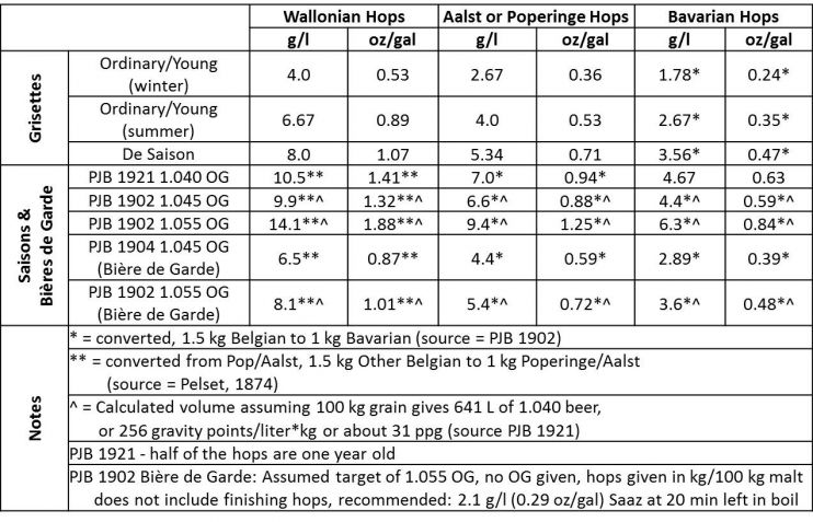 Я составил таблицу с данными о степени охмеления гризеттов, основанную на информации из работы Пельзета. Я также добавил в неё некоторые данные о сэзонах и bière de garde из Le Petit Journal du Brasseur, и снабдил с соответствующими примечаниями о тех рецептах и расчетах, которые я сделал. Пельзет замечает, что валлонские хмели (или другие хмели не оптимального качества) можно добавлять в первое сусло (WFH), в то время как сорта Poperinge и Aalst не стоит варить больше 2 часов, иначе они дадут слишком много грубой горечи. Их можно добавлять в первое сусло лишь в небольшом количестве.