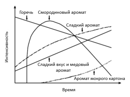 К ним относятся постоянное уменьшение горечи, усиление сладкого медового вкуса и аромата, повышение интенсивности аромата мокрого картона, а также усиление и последующее снижение запаха листьев черной смородины. Помимо изменения вкуса и аромата, наблюдается последующее снижение коллоидной стабильности, а также усиление цвета во время хранения.