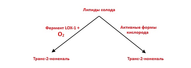 Ферментативный путь образования транс-2-ноненаля подразумевает действие ферментов липазы и липоксигеназы. При температуре 35-40 °С липаза гидролизует эфиры жирных кислот с образованием глицеридов и свободных жирных кислот, которые в дальнейшем окисляются под действием фермента липоксигеназы до гидропероксидов во время затирания при температуре 35-50 °С. Именно гидропероксиды являются прекурсорами транс-2-ноненаля.