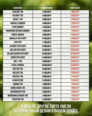В обновлённом прайсе компания Beer Resource снизила цены на весь ассортимент хмеля — лупулин Cryo Hops, Amplifire, CGX, Lupomax, гранулы Т90 и шишковой хмель.